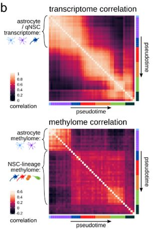Die Abbildung zeigt zwei so genannte Korrelations-Heatmaps, anhand derer die Forscher sich veranschaulichten, wie im Gehirn Astrozyten sich erst in Stammzellen und schließlich in neue Neuronen umwandeln, und wie dabei in den Zellkernen erst chemische Markierungen auf der DNA ("DNA-Methylierung", unten) und erst später die Aktivität der Gene ("Gen-Expression", oben) verändern. © Anders