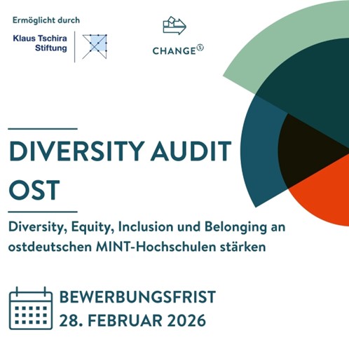 Eine Informationsveranstaltung findet am 3. Februar 2026, 11:00–12:00 Uhr, statt. Anmeldung zur Informationsveranstaltung „Diversity Audit Ost – MINT-Hochschulen stärken“ – Formular ausfüllen