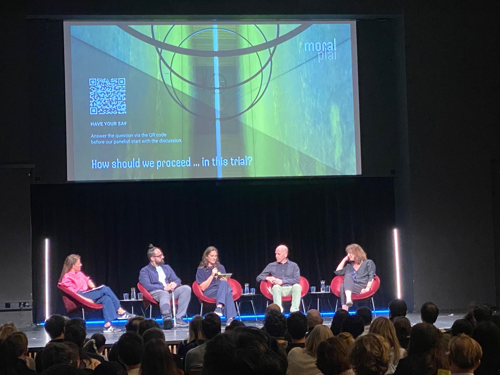 MoralPLai verbindet wissenschaftliche Forschung mit künstlerischer Praxis. „The Third Voice“ (auf Deutsch: „Die dritte Stimme“), so der Titel des forschungsbasierten Stücks, ist eine Theaterproduktion, die Chancen und Risiken auslotet, wenn Menschen in Fragen der Moral auf KI-Systeme zurückgreifen.