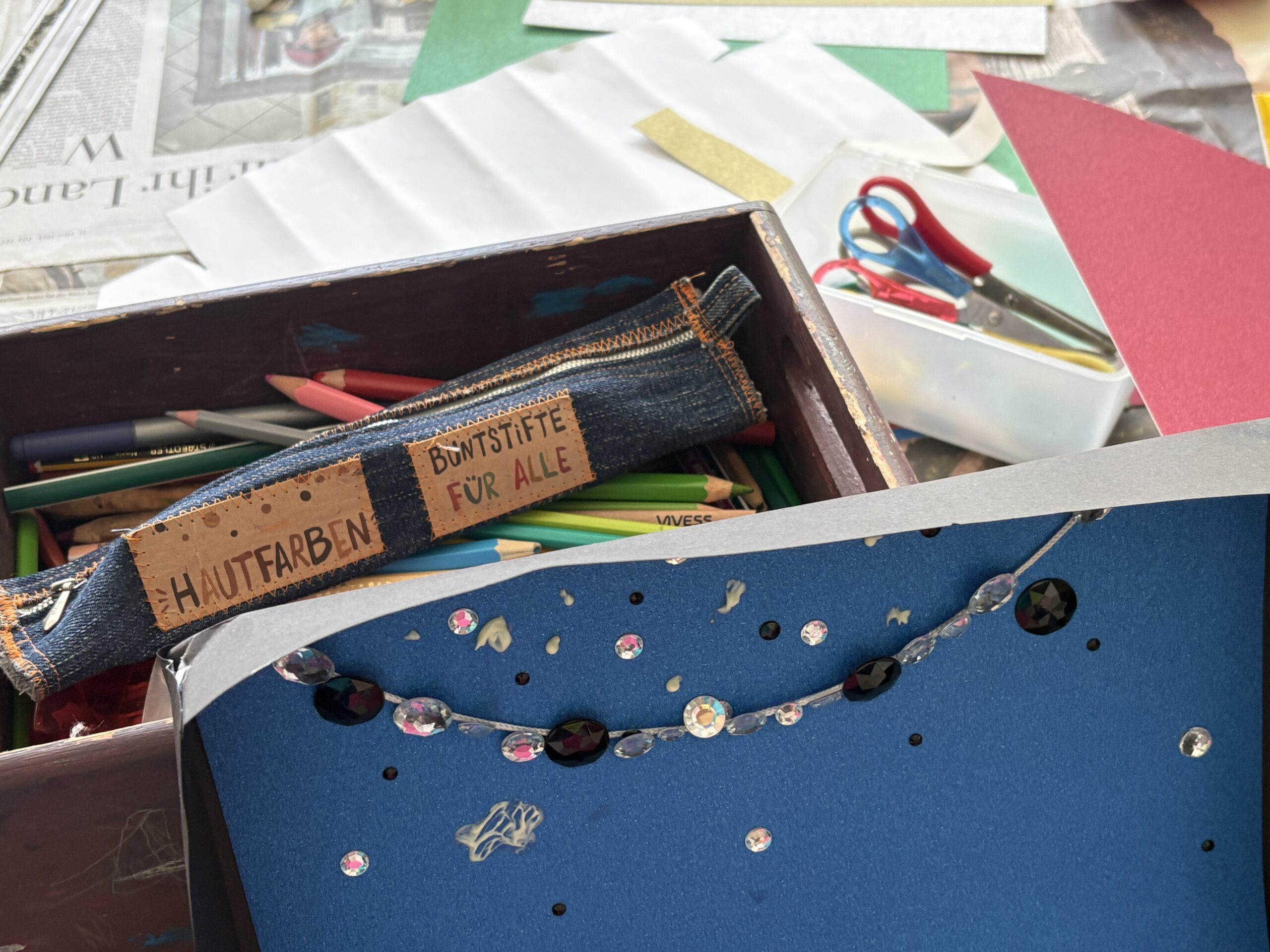 Heute wird mit schwarzem Karton eine winzige Theaterbühne gebaut. Zwei kleine Mädchen sind schon am frühen Nachmittag ins Nachbarschaftshaus gekommen. Aus glänzendem Papier stanzen sie Schmetterlinge, schneiden Bäume aus, kleben Figuren auf, malen mit fluoreszierender Farbe. „Das macht viel mehr Spaß als alleine zu Hause sitzen“, sagt die eine und strahlt übers ganze Gesicht.