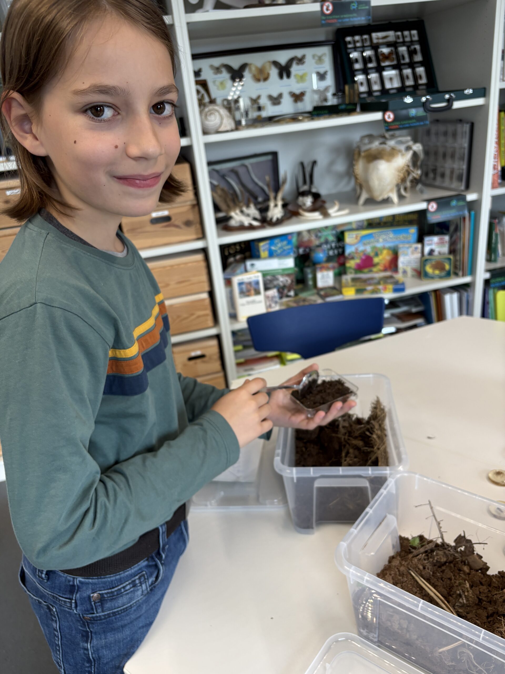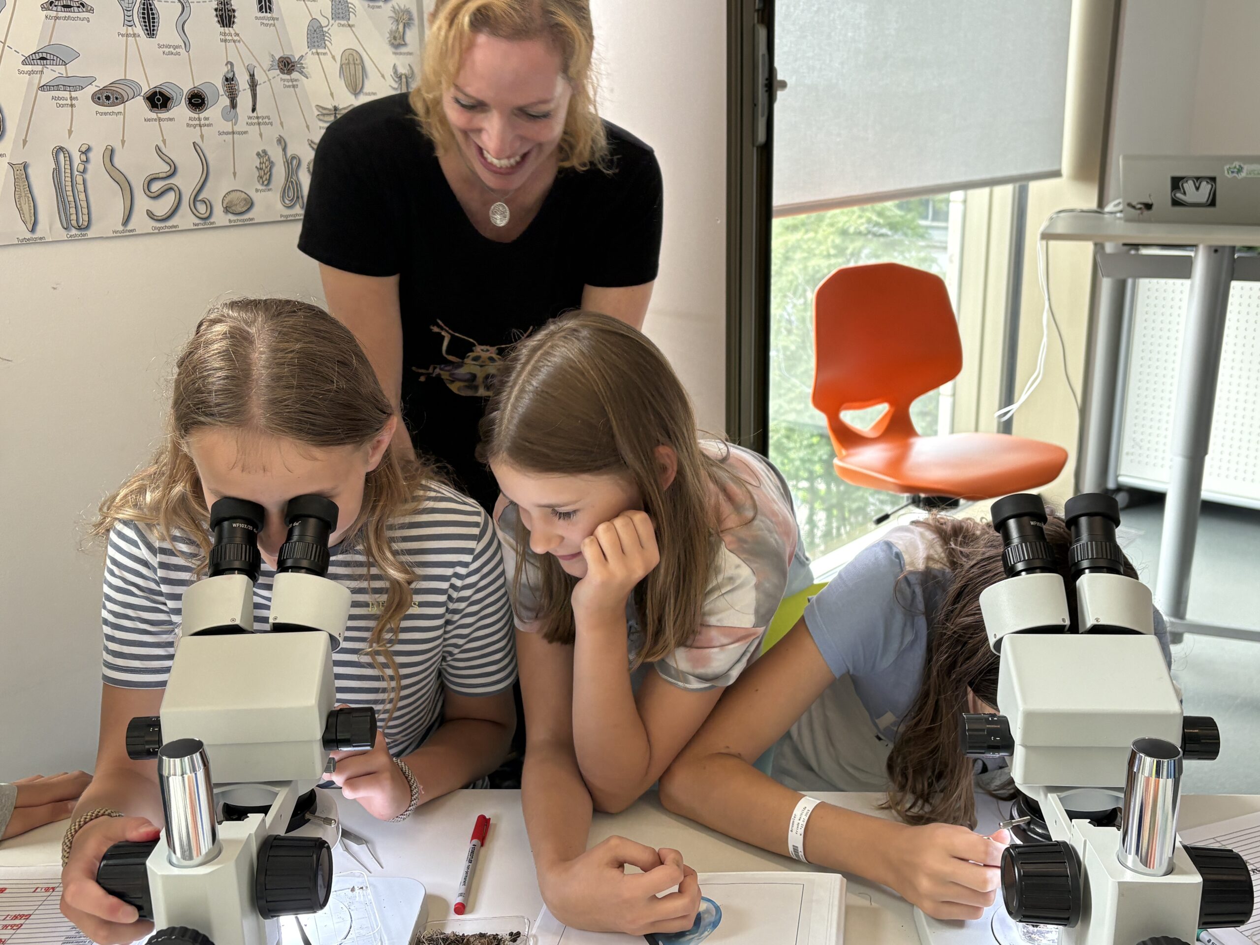 Er hat Bodenproben mitgebracht: ein Ackerboden, der in der Nähe eines Maisfeldes war, Komposterde, Waldboden und Erde von einem brachliegenden Feld. Wir alle bekommen ein so genanntes Binokular, also ein optisches Instrument, das beiden Augen ein Bild zeigt. Darunter legen wir ein wenig Boden in einer Schale. Dann heißt es warten. Ganz langsam gewöhnen sich die Augen an die kleinen Krümelchen von Steinchen, Sand und Erde und es entfaltet sich eine zauberhafte Welt der geheimnisvollen Kleinstlebewesen. Wir beobachten das Drama von „fressen und gefressen werden“, sehen Regenwürmer, Asseln, Springschwänze und Milben. Wir erfreuen uns an winzigen Schneckchen und Tausendfüßlern.